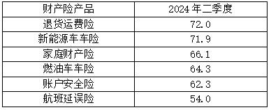 二季度對六類常見財產保險產品的消費者購買意愿調查顯示,退貨運費險、新能源車車險、家庭財產險、燃油車車險、賬戶安全險、航班延誤險等六類保險產品的購買意愿指數大于50,處于意愿較積極區間,前三位分別是: